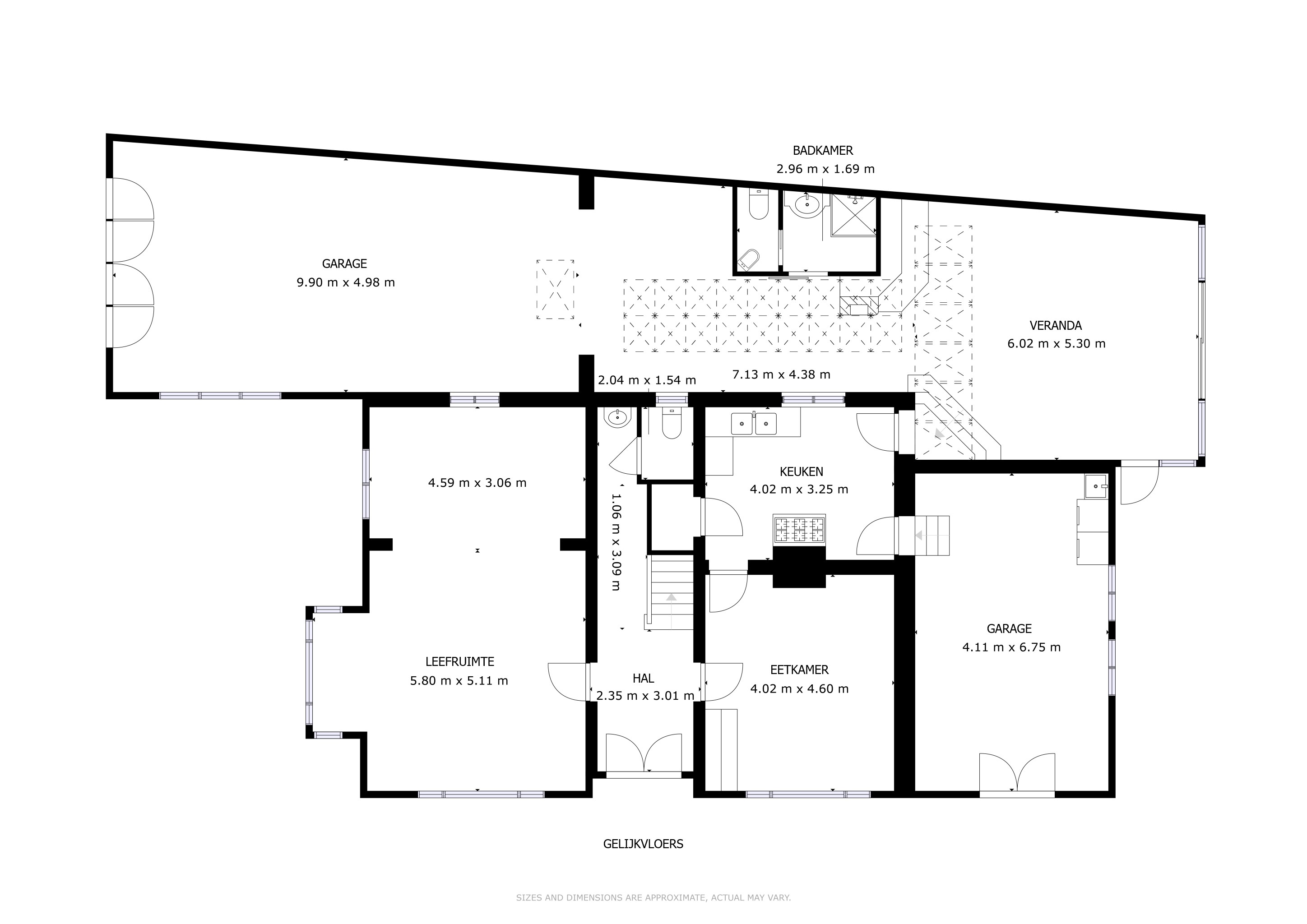 Met twee grote inpandige garages, waarvan voor één de benaming magazijn beter past, beschikt deze eigendom over parkeerplaats voor meerdere wagens of extra stockage mogelijkheden, alsook in de kelder of op de ruime zolder.